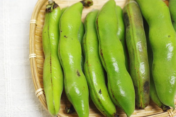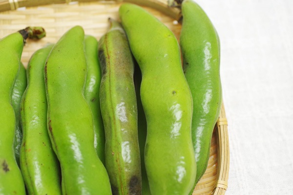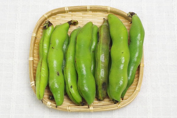 きれいなヒスイ色がさわやかな初夏を感じさせます。 サヤが天に向かって伸びるように生えるので"空豆"、 またサヤがカイコの形に似ているので"蚕豆"という字が使われます。古代文明を支えた世界最古の農作物の一つで、今でもエジプトと中国の人に愛され続けています。